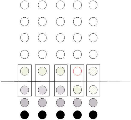 For two-qubit operations, the algorithm presented in Section 3 is slightly modified. The second qubit (i.e., the one used as a control) is teleported to the same column as the first qubit. Particularly, it is teleported at the position where the corresponding ancila qubit of the column resides (Figure 7). The controlled operations are performed in a way similar to the one described in Section 3.1, where the qubits not partaking in the operations are used as input to a controlled operation with a control qubit set to state |0⟩ via teleportation. The control qubit can then be teleported to the “vacant” spot (circle in red outline in Figure 7) by using two teleportation operations, so that the data register may once again reside in a single line of the grid. The number of operations is the same as those in Section 3.1 plus two extra steps for the final teleportation.