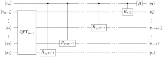 Quantum Fourier Transform (QFT) resides at the core of Shor’s algorithm. The circuit implementing the Quantum Fourier Transform is demonstrated recursively in Figure 9. In each step, qubit n is used as a control for controlled phase operations on each of the other qubits. A single Hadamard transformation is applied to qubit n at the end.