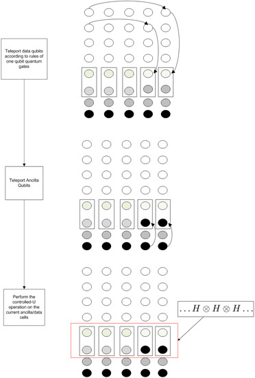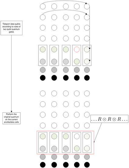 Figure 4 shows a snapshot example of the algorithm when run in the configuration depicted in Figure 3. It is clear that if all the qubits are teleported vertically down to the bottom row, only local interactions are needed in order to execute the computational step required at the starting configuration.