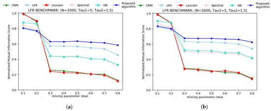 (a) Normalised mutual Information performance comparison of the proposed algorithm using Lancichinetti–Fortunato–Radicchi (LFR) benchmark. Number of nodes . (b) Normalised mutual information performance comparison of the proposed algorithm using LFR benchmark. Number of nodes The mixing parameter ranges from 0 to 0.8 with a step increment of 0.1.