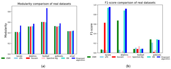 We further demonstrate the efficiency of the proposed algorithm with real-world datasets such as Zachary’s karate club network (Karate), Dolphins network (Dolphins), American football club network (Football), Kreb’s network of political books (Polbooks) and email data from European research institution (Email). Nodes and edges are indicated as n and m, respectively, whereas ground-truth represents the number of communities in the original network as shown in Table 3. The performance of the proposed algorithm is tested on real datasets against CNM, LPA, Louvain, SPA and GN algorithms using modularity measure and F1-score, which is an average of precision and recall computed from ground-truth community dataset and detected community dataset [32]. For modularity measure comparison among the stated algorithms, the number of communities to be detected for karate club network was set at 3 for SPA, GN and the proposed algorithm. For the dolphins network, the number of communities to be detected was set at 4 for SPA, GN and the proposed algorithm. For football network, the number of communities was set at 12 for SPA and GN. The proposed algorithm detected at most nine communities in the football network. Therefore, the number of communities was set at 9. For the polbooks network, the number of communities were set at 4 for SPA, GN and the proposed algorithm. For the email network, the number of communities was set at 42 for SPA and GN. Just like in the case of football network, the proposed algorithm detected at most 30 communities in the email network. Therefore, the number of communities was set at 30. As shown in Figure 3a, the proposed algorithm outperformed the compared algorithms in karate club network, dolphins network, football network and polbooks network. In the email network, the proposed algorithm performed marginally above the other algorithms. In Figure 3b, the proposed algorithm performed better than the other algorithms in Karate network and Dolphins network. Expectedly, LPA and Spectral algorithms performed better ahead of the proposed algorithm, CNM, Louvain and GN algorithms in the football network. This could be as a result of the proposed algorithm detecting at most nine communities in this network. In the polbooks network, the performance of the proposed algorithm is good but less than the performance of CNM and GN algorithms. The email network was not considered for the F1-score computation due to unavailability of its ground-truth dataset.