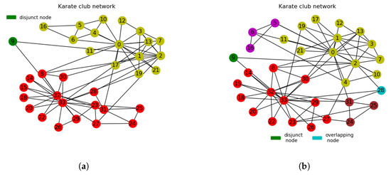 (a) Zachary’s karate club network partitioned into 2 communities with 1 disjunct node. (b) Zachary’s karate club network partitioned into 4 communities with 1 disjunct node and 1 overlapping node. The partitions overlapped by node 28 are overlapping communities. The rest of the nodes not indicated on the legends in Figure 4a,b represent different communities according to their respective colours.