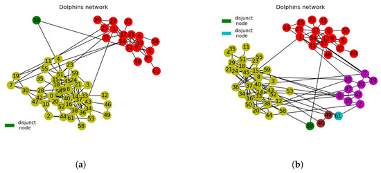 (a) Dolphins network partitioned into 2 communities with 1 disjunct node. (b) Dolphins network partitioned into 4 communities with 2 disjunct nodes. The rest of the nodes not indicated on the legends in Figure 5a,b represent different communities according to their respective colours.
