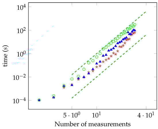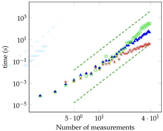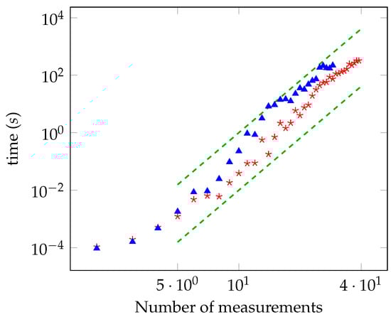 In Figure 1, we report the time required for computing the distance from the local polytope as a function of the number of measurements, M, in log-log scale. The distance has been evaluated with accuracy equal to , , and (red, blue, and green points, respectively). We have considered the case of planar measurements on the Bloch sphere. For the sake of comparison, we have also plotted the functions and (dashed lines). The data are compatible with the theoretical power law derived previously. They also show that the sublinear convergence of , derived in Section 6.2, is too pessimistic and the algorithm actually shows better performances. In particular, the bound says that the running time is not greater than years for and , whereas the observed running time is actually less than one hour. Other simulations have been performed with random measurements. We generated a set of measurements corresponding to random vectors on the Bloch sphere, by considering both the planar and non-planar case. Then, we computed the distance from the local polytope for a different number of measurements. We always observed that the running time scales with the same sixth power law. For a number of measurements below 28, we have solved the oracle with a brute-force search at the end of the computation, and we have always found that Algorithm 1 successfully converged to the solution within the desired accuracy.