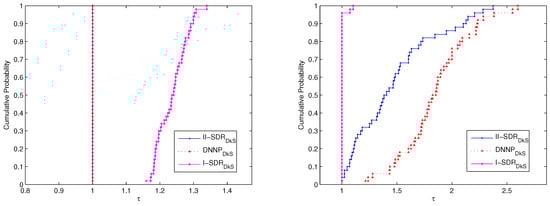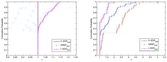 First of all, the performances of the problem and the problem as well as the problem, for solving P25 and P50, are compared. We use the performance profiles described in Dolan and Moré’s paper []. Our profiles are based on optimal values (i.e., average degree) and the number of iterations of these relaxation problems. The Cumulative Probability denotes the cumulative distribution function for the performance ratio within a factor , i.e., is the probability that the solver will win over the rest of the solvers. The corresponding comparative results of performance are shown in Figure 1 and Figure 2.