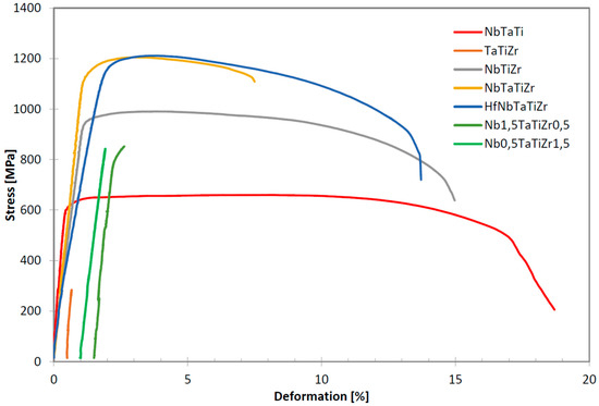 Tensile curves of investigated alloys at room temperature. Curves for brittle alloys TaTiZr, Nb1.5TaTiZr0.5 and Nb0.5TaTiZr1.5 were shifted horizontally to make them visible.