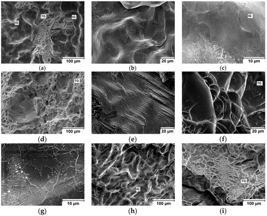 Scanning electron microscopy (SEM) image of investigated fracture surfaces: (a), (b), (c) NbTaTiZr alloy; (d) NbTaTi alloy (e) TaTiZr alloy; (f) NbTiZr alloy; (g) Nb1.5TaTiZr0.5 alloy; (h), (i) Nb0.5TaTiZr1.5 alloy; where TG denotes transgranular ductile fracture and IG intergranular ductile fracture.