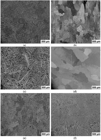 SEM image of investigated alloys microstructure: (a) NbTaTiZr alloy; (b) NbTaTi alloy; (c) TaTiZr alloy; (d) NbTiZr alloy; (e) Nb1.5TaTiZr0.5 alloy; (f) Nb0.5TaTiZr1.5 alloy.