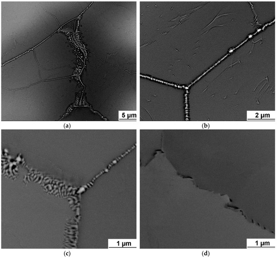 Intensive precipitation at grain boundaries was observed in the brittle TaTiZr alloy, see Figure 4. This alloy contains highest combined content of Ta + Zr and a low amount of the BCC1 phase.