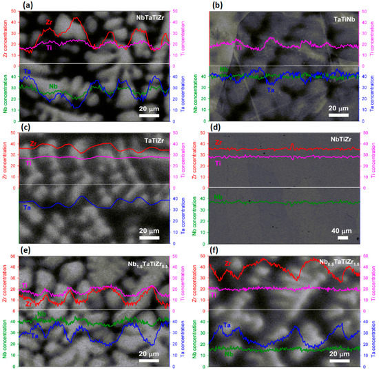 WDS line analysis of: (a) NbTaTiZr alloy; (b) TaTiNb alloy; (c) TaTiZr alloy; (d) NbTiZr alloy; (e) Nb1.5TaTiZr0.5 alloy; (f) Nb0.5TaTiZr1.5 alloy.