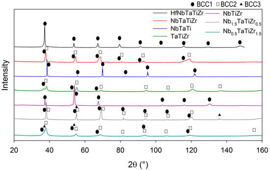 X-ray diffraction (XRD) patterns of investigated alloys. Reflections of the BCC phases are marked by labels.