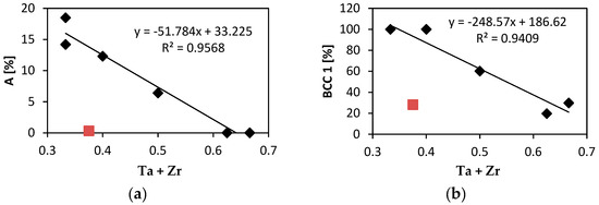 (a) Relation of the total elongation to failure A on the sum of Ta and Zr atomic concentration, (b) the concentration of the BCC1 phase plotted as a function of the sum of Ta and Zr content. Data for Nb1.5TaTiZr0.5 alloy are indicated by red symbols and were excluded from linear regression.