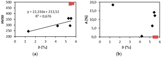 Relation of δ and: (a) HV30; (b) elongation.