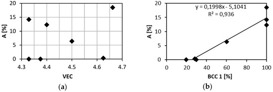 Relation of the elongation to failure and: (a) the VEC parameter; (b) the content of BCC 1 phase.