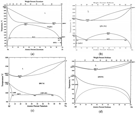Binary phase diagrams: (a) Ta-Zr. Reprinted from [30] with permission of Springer Nature; (b) Nb-Zr. Reprinted from [31] with permission of Springer Nature; (c) Ta-Hf. Reprinted from [32] with permission of Springer Nature; (d) Nb-Hf. Reprinted from [33] with permission of Springer Nature.