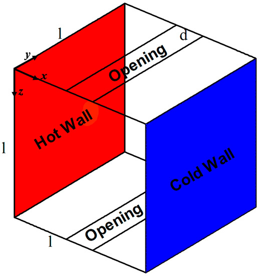 The studied configuration is presented with coordinates in Figure 1. The model consists of a cubical cavity having two openings, i.e., one each at the bottom and ceiling. The right and left walls are differentially heated, and all remaining walls are considered adiabatic. The fluid (air) is considered incompressible, and the Boussinesq approximation is considered.