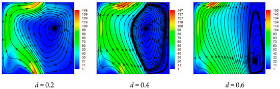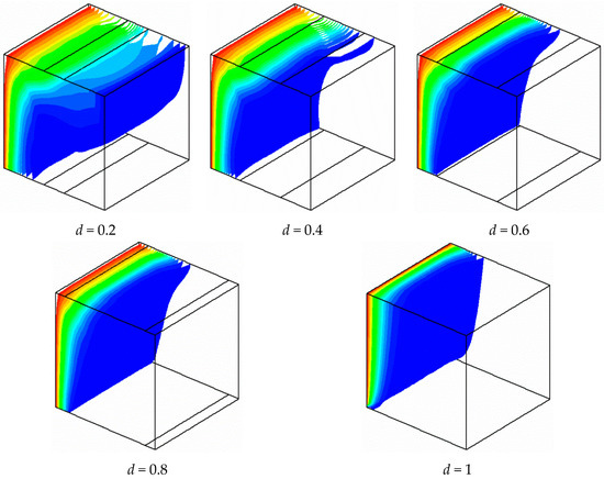 As seen from the results of the temperature fields presented in Figure 5, iso-surfaces of temperature are pushed to the heated wall with increases in the opening ratio. This result is due to the increase of the flow velocity created by the presence of the openings. For d = 0.2, vertical stratification exists in the central region of the cavity due to the great size of the circulation vortex. By increasing the openings size, the vertical stratification disappears and the iso-surfaces of temperature become more piled near the hot wall due to the disappearance of the recirculation vortexes caused by the direct flow between the bottom and top openings.