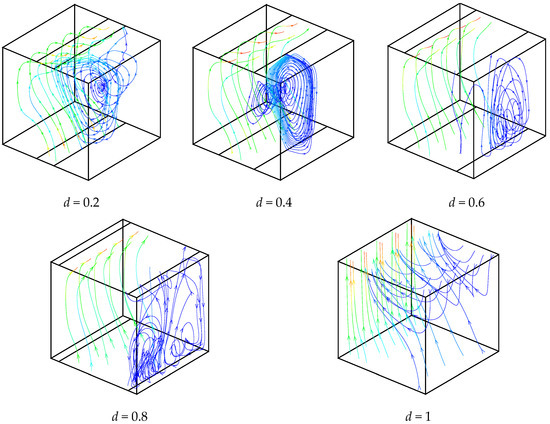 In order to show the 3D structure of the flow, Figure 4 illustrates some particles trajectories for different opening widths at Ra = 105. The obtained results are compared with a fully opened case. As seen from the figure, the opening ratio directly effects the circulation cell dimension and location. For a fully opened case, no circulation cell is formed inside the cavity. This is an interesting result; flow does not have any circulation near the hot side for all cases due to a higher flow velocity. Due to the existence of circulation vortexes (for d < 1), the fluid passes transversally through the enclosure, which represents a purely 3D characteristic. For all presented cases, the circulation vortexes are convergent from the front and back walls to the center of the cavity.