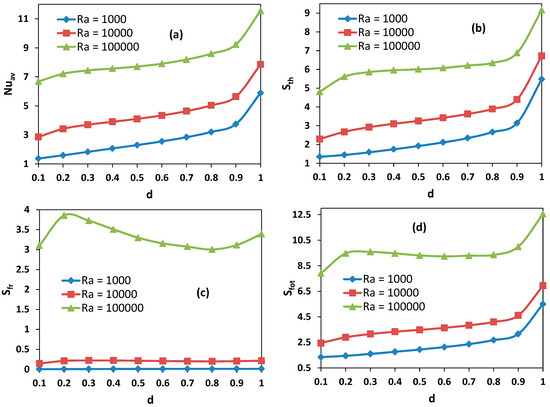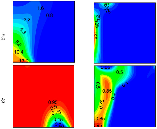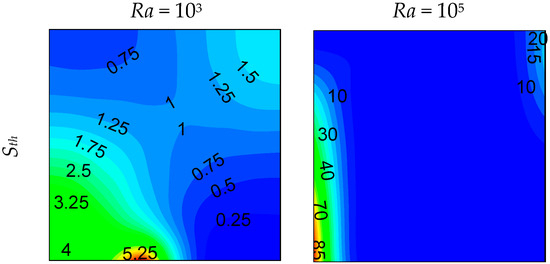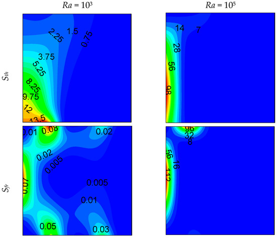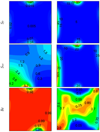 Local entropy-generated contours at z = 0.5 plan are shown in Figure 6, Figure 7 and Figure 8 for different opening sizes and different Rayleigh numbers. For low Rayleigh numbers and small opening ratios, thermal entropy generation (Sth) is distributed across the entire domain. By increasing the Rayleigh number, Sth becomes concentrated near the hot wall, and by increasing d, it becomes concentrated near the bottom right corner due to the increase of temperature gradients in this region, as shown in Figure 5. In contrast to thermal entropy generation, frictional irreversibility becomes distributed across the entire cavity by increasing the opening ratio due to the enlargement of the domain from where the flow passes from the bottom to the top opening, causing an intensification of the flow, and consequently, an increase of the fluid-fluid friction. In all cases, the total entropy profile is similar to that of the thermal one, showing a dominance of Sth compared to Sfr, especially for low Rayleigh numbers, where Sth dominates in the domain. For higher Ra, the dominance is more pronounced on the right side of the cavity. This ascertainment is boosted by the Bejan number profile.