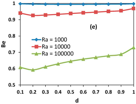 Figure 9a–e present the variations of average Nusselt number, thermal, viscous and total entropy generations and Bejan number with opening ratio. It is observed that higher heat transfer occurs for higher values of Ra, and that heat transfer increases almost linearly with opening ratio. This increment is clear for the lowest value of the Rayleigh number. Similarly, thermal entropy generation increases with both Rayleigh numbers and opening ratio almost linearly. But there is a huge increment for fully opened cavities.