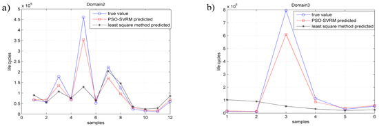 Since there is only one fatigue sample in the fatigue characteristic domain1, it is not discussed here. The PSO-SVRM model for fatigue life prediction of titanium alloy welded joints was established in the determined fatigue characteristic domains, from domain2 to domain5, respectively. The fatigue life prediction values of the titanium alloy welded joints by using the PSO-SVRM model were compared with that obtained by using the tradition least square fitting method and the actual fatigue life obtained through fatigue test. The comparison results are shown in Figure 5. The error of fatigue life prediction by using PSO-SVRM model and by using the traditional least square fitting method is shown in Figure 6.
