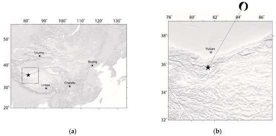 An Ms7.3 earthquake (Figure 1) struck Yutian County, Xinjiang Uygur Autonomous Region, China on 21 March 2008 [1,2]. The moment magnitude of the Yutian earthquake was Mw 7.1 [3]. Instead of the Mw, which is a well adopted magnitude for earthquakes, the Ms unit is adopted in this study because it is the officially reported magnitude of earthquakes by China Earthquake Administration (CEA). The epicenter locations and rupture models that have been reported by several earthquake agencies are very different from each other [1]. To have a better understanding about the seismogenic structure and rupture process of the Ms7.3 Yutian earthquake, Institute of Geology, CEA and Earthquake Administration of Xinjiang Uygur Autonomous Region made a joint scientific investigation on the Ms7.3 Yutian earthquake and the Ashikule Volcanoes in May 2011 [3]. The related results indicated that the Ms7.3 Yutian earthquake is an inland normal faulting event that combines with the partial left-lateral faulting component [1,3] (also see Figure 1b for the focal mechanism of the Yutian earthquake).
