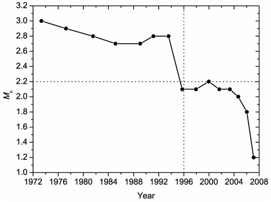 It is well-known that artificial seismicity changes may arise from the changes of the seismic network, e.g., station distribution, upgrades of seismic instruments and data management software, etc. [18,23]. To minimize the possible artificial effect on seismicity changes, it is important to have some pre-processing of the seismological data of earthquake catalog before the application of the RTL method. The data pre-processing mainly includes aftershock declustering and completeness analysis [18]. The aftershocks of the CEA earthquake catalog were declustered using the approach given in [24]. The completeness of the CEA earthquake catalog was evaluated based on the power-law of frequency–magnitude [25]. Figure 2 shows the temporal change of the completeness magnitude of the CEA earthquake catalog in Yutian area. The result indicates that the completeness magnitude decreases with time (Figure 2), i.e., the detectability of the earthquakes increases with time. As shown in Figure 2, the CEA earthquake catalog in Yutian area is complete for earthquake with magnitude M ≥ 2.2 after 1 January 1996 (marked by the vertical dashed line). Therefore, the CEA earthquake catalog from 1 January 1996 to 21 March 2008 with a completeness magnitude (Mc) of 2.2 is chosen in this study, which can satisfy both the completeness of the earthquake catalog, and enough number of events for seismicity analysis.