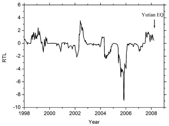 Applying the RTL method to the above declustered and complete earthquake catalog in Yutian area, one can obtain the seismicity changes in the same area. Due to the selection of the characteristic time span (t0) in Equation (1), the calculated RTL parameters will be available after a time window of 2t0 from the starting investigated time of the earthquake catalog [18]. In this study, the characteristic time span is adopted as t0 = 1 year, and the start of the investigated time of earthquake catalog is 1 January 1996 (as shown in Section 3.1). Hence, the available time window of the calculated RTL parameters is from 1 January 1998 to 21 March 2008 (as shown in Figure 3). Figure 3 gives the temporal change of the seismicity, which is revealed by the calculated RTL parameters, in the epicentral area of the 2008 Ms7.3 Yutian earthquake. The result shows that a quiescence anomaly of seismicity began in 2004, and developed in 2005 in the Yutian area. The seismicity recovered to background levels in 2006. The Ms7.3 Yutian earthquake did not occur immediately after the seismicity recovered to the background level. Instead, it occurred with a time delay of about two years, as indicated by the vertical arrow in Figure 3.