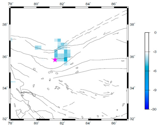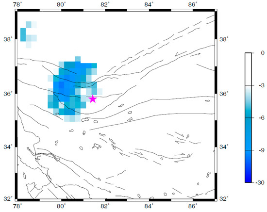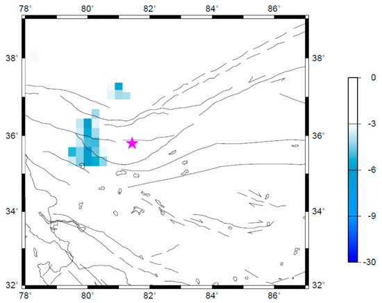 Besides the temporal change of seismicity, the spatial distribution of seismicity can strengthen the reliability of the correlation between the revealed seismicity changes and the target earthquake. The Q parameter, which is defined by Equation (3), was adopted to quantify and investigate the spatial variations of the quiescence anomaly of seismicity associated with the Ms7.3 Yutian earthquake. The interval of the time window [tA, tB] was chosen as six months in this study, i.e., tB − tA = 6 months. Although the selection of this interval was somehow empirical [18,21], the key concern was that the target time scale for seismicity changes in this study was in order of about one year. A sliding interval of six months in a time window should be enough to reveal the temporal evolution of the Q-map (the map of quiescence anomaly of seismicity). Therefore, one can obtain the Q-map for each time interval of six months (i.e., the time window [tA, tB]) with respect to the background seismicity from the start time of the adopted complete earthquake catalog (i.e., 1 January 1996 in this study) to the ending time tB. The temporal changes of the Q-map can be obtained by sliding the calculated ending time of the earthquake catalog (i.e., tB in this study). The temporal change of seismicity in Yutian area showed that the most significant quiescence appeared at around late 2005 (Figure 3). As an example, Figure 4 shows the spatial map of the quiescence anomaly of seismicity in the investigated region for a time window [tA, tB] of July–December 2005. An anomalous zone of seismic quiescence appeared near the epicentral region of the Yutian earthquake (the epicenter is marked by a star in Figure 4). The linear dimension of the anomalous quiescence zone was about 200 km (Figure 4).