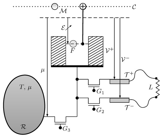 Closely related to our system are some theoretical and experimental papers where electrons are transferred between thermo-chemical reservoirs under the presence of Maxwell’s demons. In Reference [58] electrons are moved against a potential using the entropy generation associated with information erasure in the detector. Reference [59] describes a theoretical model with an autonomous Maxwell’s demon coupled to a Single Electron Transistor (SET), which can extract entropy from the system and dump it into its own thermo-chemical reservoir. This kind of system has been demonstrated [60] in an experimental setup, where the action of the demon was revealed by measuring the cooling of a reservoir connected to the SET and the heating of a reservoir connected to the demon.