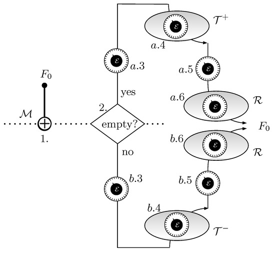 - Branching. According to the value of , the process may take two possible ways. First, we assume that F is in state , where it is more likely to be occupied (case a) and then we describe the steps taken if F is in state (case b), when it is more likely to be empty.