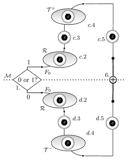 - Branching. The qubit is projected into its computational basis and one of two paths is selected. The value 1 (case c) branches into a sequence of steps which correspond to the upper part of Figure 6, whereas the value 0 (case d) selects the lower part of the figure.