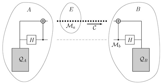 Figure 10. Outline of the security based on shared entangled qubit pairs. The Quieg works in the reverse mode, outputting qubits in a state. are two of them. After they are generated, undergoes a Hadamard gate and controls a CNOT targeted at . Then, is taken to node B. This transfer is made before the system begins to work and may be done for a big number of pairs. For example, it may take place before B signs-in into the network or when it renovates its subscription. It does not occur over the communication line . Then, qubits circulate over . When B needs to use them at , undoes the transformations performed by the CNOT and Hadamard gates. Then, B obtains two qubits in a ready to be used in the Quieg. Please note that if user E want to use , it will be useless for a Quieg working in the direct mode, because it is in a maximally mixed state.Next, A applies an entangling unitary operation to a pair of qubits . First, a Hadamard gate is applied to , so that it transforms into the stateThen, a CNOT controlled by takes the system from the joint statetoNext, B takes the part of the pair. The reduced states for and are equal. They are the partial traces of the matrix representing the state given by Equation (42) with respect to and , respectively. They are given bywhich is the maximally mixed state. This implies that individually, are useless. B keeps and A sends over the communication line .Then, when B needs to fuel its Quieg working in the direct mode, takes , so that it has the system in the state given by Equation (42). Subsequently, B applies a CNOT gate controlled by and targeted at followed by a Hadamard on . This takes the pair to the state given byThis represents two qubits in the state, with which the Quieg at B can execute two cycles. So that the net effect is equivalent to the remote informational voltage transformer of Section 6 or a Carnot engine of Section 7. The only qubit traveling through the line is whose reduced state is maximally mixed and, therefore, useless for any unauthorized user E. - If A and B have no previous entangled states or secret key, then they must obtain a private key communicating through a public line. The classical RSA protocol can be used, but quantum computers could crack the key. On the other hand, QKD protocols could be used that offer quantum privacy. However, QKD consumes resources, and this implies that there is an additional cost for security. There have been several QKD protocols described. The best-known one is the BB84 [72], after Bennet and Brassard, who proposed it in 1984. These protocols consume resources because at some point they generate entropy. To reset the system for another cycle, the entropy must be evacuated elsewhere and this needs qubits in a not maximally mixed state (for example, the BB84 generates entropy when Bob measures the qubits sent by Alice in the wrong basis).