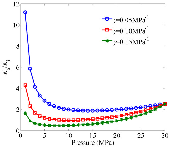 Figure 1 shows the effect of the permeability modulus on Ka/Ki under different pressures. It can be seen that Ka/Ki first decreases as the pressure decreases from 30 MPa, and then Ka/Ki increases as the pressure continues to decrease, which results from the combined influences of the gas slippage and stress-sensitivity pore structures. With the decrease of the pressure, the gas-slippage effect makes the permeability increase, while the stress-sensitivity effect makes the permeability decrease. The stress-sensitivity effect plays a more important role in gas transport with the increase of the permeability modulus. For a fixed value of the permeability modulus, the gas-slippage effect becomes gradually significant as the pressure decreases.