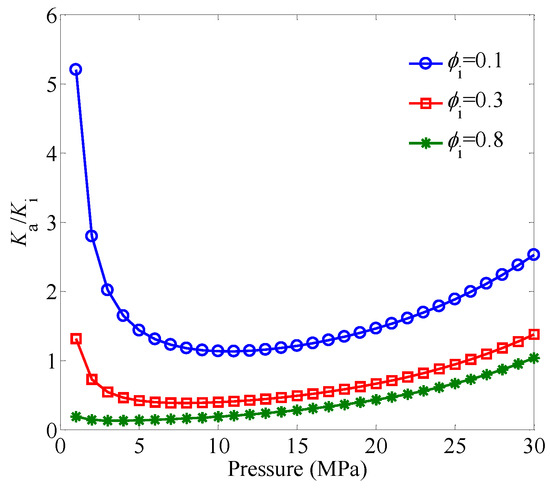 Figure 2 shows the effect of the initial porosity on under different pressures. It is clear that the gas-slippage effect becomes more obvious with the decrease of the initial porosity. For a fixed value of the initial porosity, the gas-slippage effect increases with the decrease of the pressure.