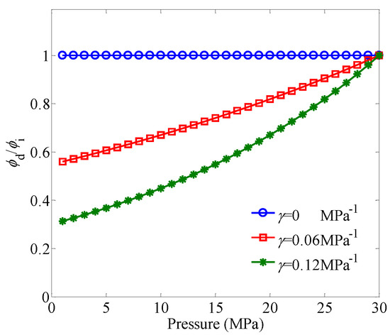 Figure 3 shows the effect of the permeability modulus on under different pressures. For a given pressure, the value of decreases with the increase of the permeability modulus. When , the stress-sensitivity effect is neglected, and thus the porosity remains constant under different pressures. When the value of is small (e.g., ), the porosity decreases linearly as the pressure decreases. However, with the increase of the value of , a nonlinear relationship between the porosity and pressure will appear.