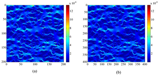 The grid dependency for the simulation results is tested based on the structure of the porous medium shown in Figure 6. The two different grid sizes, namely 200 × 200 and, 400 × 400 are employed to simulate the gas flow. The effect of the grid number on the velocity magnitude distributions in the porous medium is shown in Figure 7. The velocity magnitude, , is defined as . There is no obvious difference between the velocity magnitude distributions based on the two grid system. The global permeability is introduced to quantify the seepage capability of the porous medium. Note that the global permeability defined by Chen et al. [27] is dependent on the flow field in the entire domain rather than the local characteristic of a porous medium. The definition of the global permeability is given as follows: