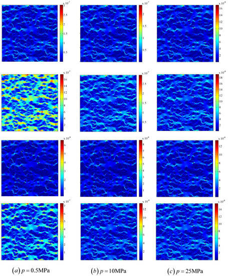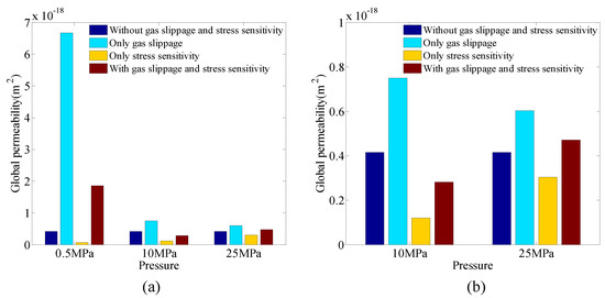We will focus on the effects of the multiple mechanisms on the global permeability. Figure 11 shows the effects of the gas slippage and stress-sensitivity pore structures on global permeability under different pressures. It is observed that the gas slippage and stress-sensitivity pore structures significantly affect the global permeability. The gas-slippage effect increases the global permeability and becomes stronger with a decrease of the pressure. The stress-sensitivity effect decreases the global permeability as the pressure is reduced. In general, the global permeability of a porous medium deep underground is affected by the combined influences of the gas slippage and stress sensitivity. The quantitative comparison between the global permeability with and without the effects of the gas slippage and stress-sensitivity pore structures is listed in Table 3, from which it can be seen that compared with the stress-sensitivity effect, the gas-slippage effect becomes more significant in matrix, especially under low pressure.