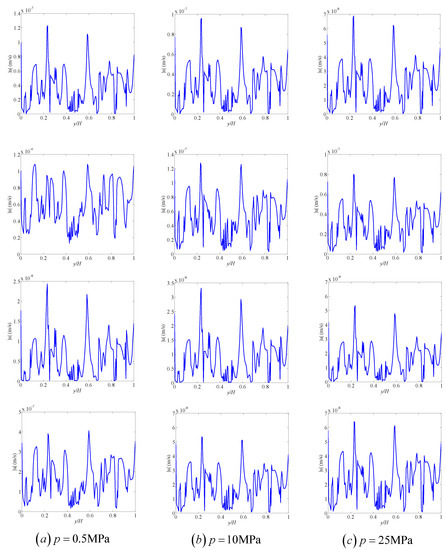 Figure 9 shows the effects of the gas slippage and stress-sensitivity pore structures on velocity magnitude distributions in the porous medium. The gas-slippage effect enhances the global velocity magnitude, while the stress-sensitivity effect reduces the global velocity magnitude as shown in Figure 9. It is seen that under a fixed pressure, the velocity magnitude distributions are different for the cases with and without the gas-slippage and stress-sensitivity effects, which is because these influencing factors have different effects on gas transport in different materials. Figure 10 shows the effects of the gas slippage and stress-sensitivity pore structures on the velocity magnitude profiles at the outlet of the porous medium. It is clear that the velocity magnitude profiles at the outlet are also different for the cases with and without the gas-slippage and stress-sensitivity effects. Therefore, multiple mechanisms, including gas slippage and stress sensitivity of permeability and porosity, affect not only the global velocity magnitude, but also the flow field. To obtain a correct prediction of gas flow in porous media, these mechanisms should be considered in simulations.