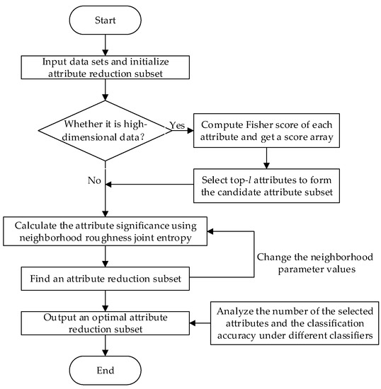Uncertainty measures play an important role in the uncertainty analysis of granular computing models [33]. Ge et al. [34] researched a positive region-based reduction algorithm from the relative discernibility perspective in rough set theory. Sun and Xu [35] proposed a positive region-based granular space for feature selection based on rough sets. Nevertheless, the positive region in these models only draws attention to the consistent samples whose similarity classes are completely contained in some decision classes [36]. Meng et al. [37] presented an intersection neighborhood for numerical data, and designed a gene selection algorithm using positive region and gene ranking based on neighborhood rough sets. Liu et al. [38] designed a hash-based algorithm to calculate the positive region of neighborhood rough sets for attribute reduction. Li et al. [39] investigated a positive region-based related attribute reduction in neighborhood-based decision-theoretic rough set model. In summary, these literatures about attribute reduction are all based on rough sets or neighborhood rough sets from algebra view. And some of the abovementioned algorithms can achieve optimal reducts with criterion preservation, but in a sense, their reducts still have some redundant attributes that can be further deleted [2]. What’s more, a lot of reduction algorithms still have higher time expenses when dealing with high-volume and high-dimensional data sets.