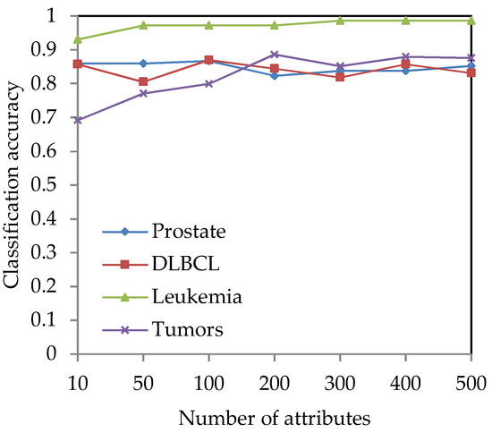 From Figure 2, it can be seen that when the number of genes increases, the classification accuracy is also changed. Since the cardinality of selected genes and the classification accuracy for selected genes are all important, they are two indices for evaluating the classification performance of attribute reduction methods. Then, the appropriate values of l need to be selected from Figure 2. Hence, the values of l are set to 50-dimension and 100-dimension for the Prostate and DLBCL data set, respectively. For the Leukemia and Tumors data sets, the values of l can be set to 300-dimension and 200-dimension, respectively.