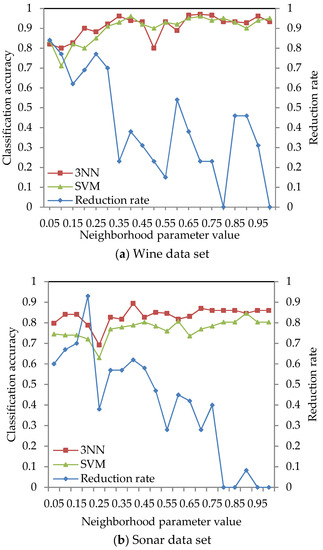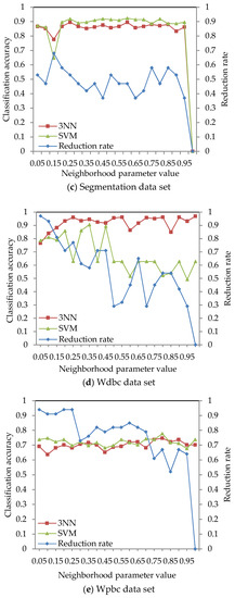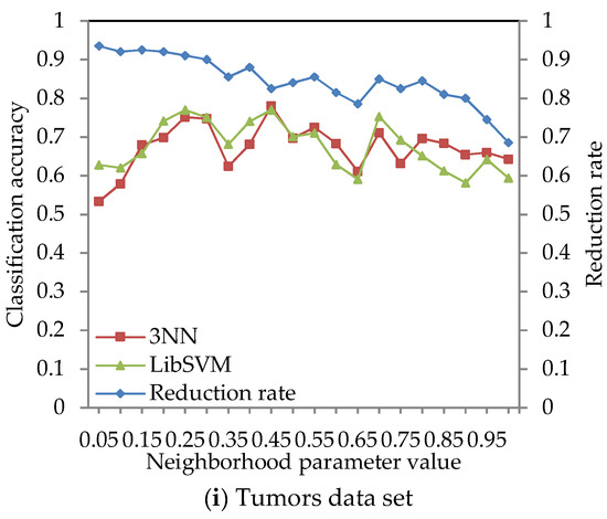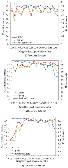 Figure 3 shows that the classification accuracy of selected attributes by the ARNRJE algorithm is increasing, and the reduction rate is decreasing with the neighborhood parameter values changing from 0.05 to 1 in most cases. It is easily observed that the different neighborhood parameter values have great influence on the classification performance of ARNRJE. Then, this illustrates that the thinner the granule is, the smaller the roughness of the granule is when the values of different neighborhood parameter are smaller. It follows that the reduction rate increases as the roughness of the granule decreases. Thus, the optimal neighborhood parameter values can be selected for each data set. Figure 3a shows the classification accuracy of the Wine data set with different neighborhood parameter values, and the neighborhood parameter can be set to 0.65. Figure 3b demonstrates the classification accuracy of the Sonar data set with different neighborhood parameter values. The reduction rate decreases as the neighborhood parameter values increase, and the classification accuracy of selected attributes reaches the relative maximum value when the neighborhood parameter is 0.4. So, the neighborhood parameter of the Sonar data set can be set to 0.4. From Figure 3c, it can be seen that the classification accuracy reaches the relative best performance when the parameter equals 0.75 on the Segmentation data set. Figure 3d displays the classification accuracy of the Wdbc data set for the different neighborhood parameters. The neighborhood parameter of the Wdbc data set can be set to 0.35. Similar to Figure 3b, Figure 3e reveals the classification accuracy of selected attributes reaching a relative maximum when the parameter is set as 0.55 for Wpbc data set. For Prostate and DLBCL with the different neighborhood parameter values in Figure 3f,g, the neighborhood parameter of the Prostate data set can be set to 0.9, and that of the DLBCL data set should be set to 0.5. Figure 3h,i demonstrates that the reduction rate is decreasing as the parameters increase in most situations, and the neighborhood parameter of Leukemia and Tumors data sets can be set to 0.4 and 0.25, respectively.