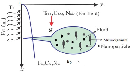 The study of motion through a porous space is also very important in engineering and industrial processes. A porous media is a material having pores, i.e., oxides and metals, where these pores are covered with a fluid. Such type of motion has two main benefits, as its area of dissipation is higher as compared to conventional fins that improve the heat convection. Further, the regular flow of a fluid along the whole individual beads blends the fluid effectively. The nanofluid flow through a porous media reveals enhanced thermal properties, i.e., convective heat transfer coefficients as compared with a base material and higher thermal conductivity. Consequently, a porous media having nanoparticles plays a vital role in the enhancement of heat transfer and this mechanism is very important from an application and theoretical point of view. Such types of flow can be seen in filtration, oil flow, heat exchangers, drying process and geothermal systems. Moreover, nanofluid flow through a porous media has many applications in thermal engineering which are favorable to improve the thermal properties of lubricants and oil, electronic cooling equipment and vehicle cooling. Applying Navier-Stokes equations to the physical problems, Khan et al. [] examined the important role of flow and transfer in a second-grade fluid through a porous medium past a stretching sheet in which the porous medium carries a leading role. Their results show a close agreement with the published work. It is very important to explain how nanofluid flow is possible in a porous medium. Thus, without special precautions, nanoparticles will be simply absorbed by the porous matrix. Basically, the porous matrix will work as a filter for nanoparticles. This situation has been described, explained and modeled in the paper by Wu et al. []. The physical situation described in this paper reveals that the work on porous media filled by nanofluids is not just a mathematical challenge, but is based on a deep physical understanding of nanofluid flows. This demonstrates that we are simulating here a real physics problem of mixed convection flow and heat transfer in a porous medium filled by a nanofluid. Kuznetsove [] has compiled the studies on the developments of bioconvection in porous media caused by either gyrotactic or oxytactic microorganisms, with the limitation of average pore size is larger than the size of a microorganism, which allows the smooth movement of the microorganisms. Tham et al. [] numerically studied the steady mixed convection boundary layer flow on a horizontal circular cylinder with a constant surface temperature embedded in a porous medium saturated by a nanofluid containing both nanoparticles and gyrotactic microorganisms in a stream flowing vertically upwards for both cases of a heated and cooled cylinder. The objective of that paper is to understand the behavior of nanofluid suspensions containing nanoparticles, gyrotactic microorganisms and entropy generation at the fundamental level.