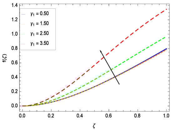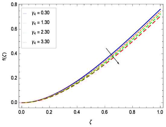 Effect on velocity profile for h = −1.00, = 0.50, = 0.20, = 0.30, = 1.00, Gr = 0.50, Nr = 0.60, Rb = 0.70, Nb = 0.80, Nt = 0.90, Le = 0.60, Sc = 0.70, Pe = 1.00, M = 1.00, Pr = 10.00 and different values of .
