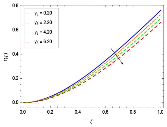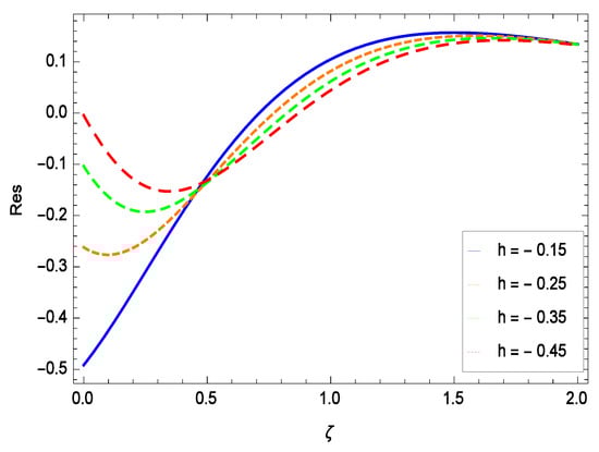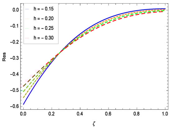 Effect on velocity profile for h = −1.30, = 0.60, = 0.20, = 0.30, = 1.00, Gr = 0.50, Nr = 0.60, Rb = 0.70, Nb = 0.80, Nt = 0.90, Le = 0.60, Sc = 0.70, Pe = 1.00, M = 1.00, Pr = 10.00 and different values of .