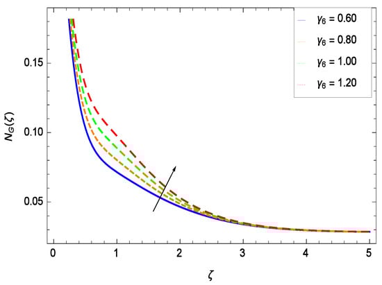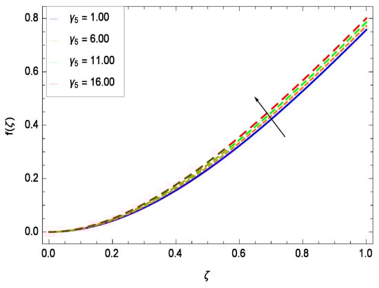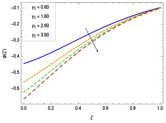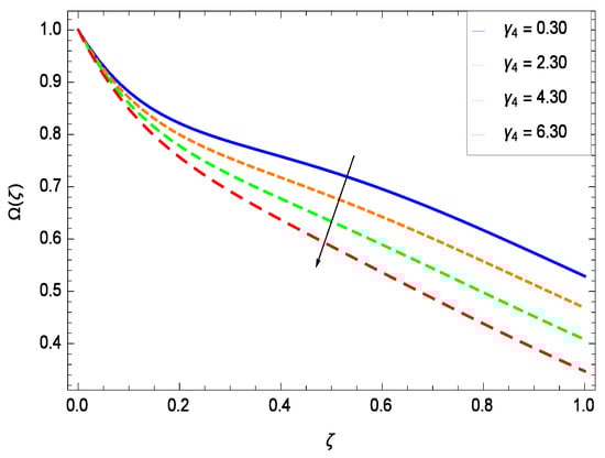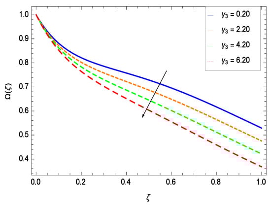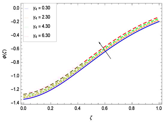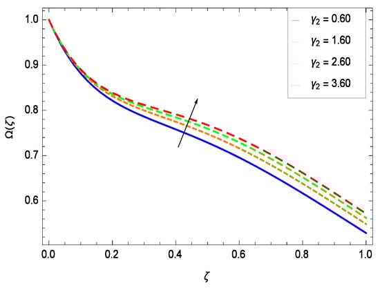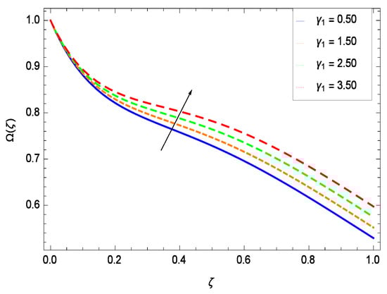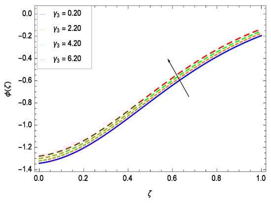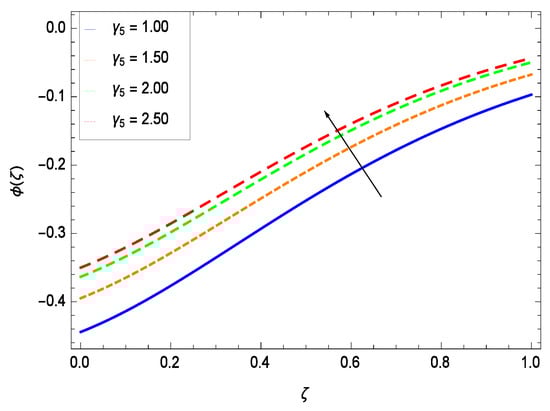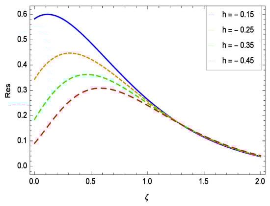 Effect on temperature profile for h = −0.80, = 0.50, = 0.20, = 0.30, = 1.00, Gr = 0.50, Nr = 0.60, Rb = 0.70, Nb = 0.80, Nt = 0.90, Le = 0.60, Sc = 0.70, Pe = 1.00, M = 1.00, Pr = 10.00 and different values of .
