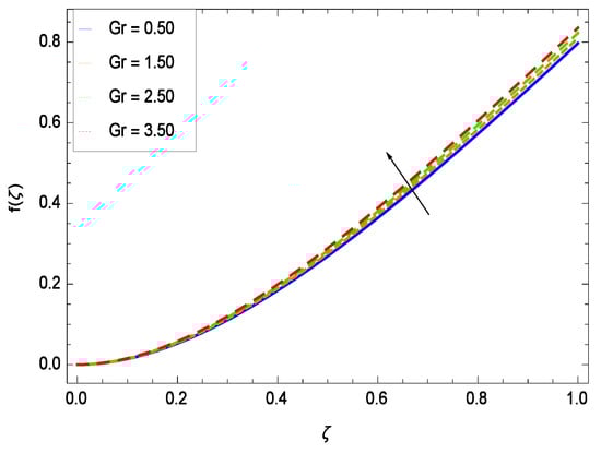 Effect on velocity profile for h = −1.10, = 0.50, = 0.60, = 0.20, = 0.30, = 1.00, Nr = 0.60, Rb = 0.70, Nb = 0.80, Nt = 0.90, Le = 0.60, Sc = 0.70, Pe = 1.00, M = 1.00, Pr = 10.00 and different values of Gr.