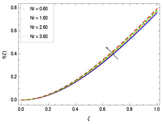 Effect on velocity profile for h = −3.00, = 0.50, = 0.60, = 0.20, = 0.30, = 1.00, Gr = 0.50, Rb = 0.70, Nb = 0.80, Nt = 0.90, Le = 0.60, Sc = 0.70, Pe = 1.00, M = 1.00, Pr = 10.00 and different values of Nr.