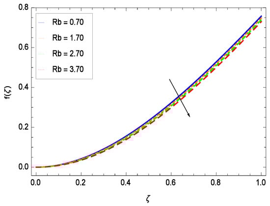 Effect on velocity profile for h = −3.00, = 0.50, = 0.60, = 0.20, = 0.30, = 1.00, Gr = 0.50, Nr = 0.60, Nb = 0.80, Nt = 0.90, Le = 0.60, Sc = 0.70, Pe = 1.00, M = 1.00, Pr = 10.00 and different values of Rb.