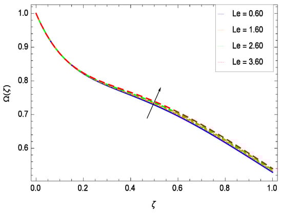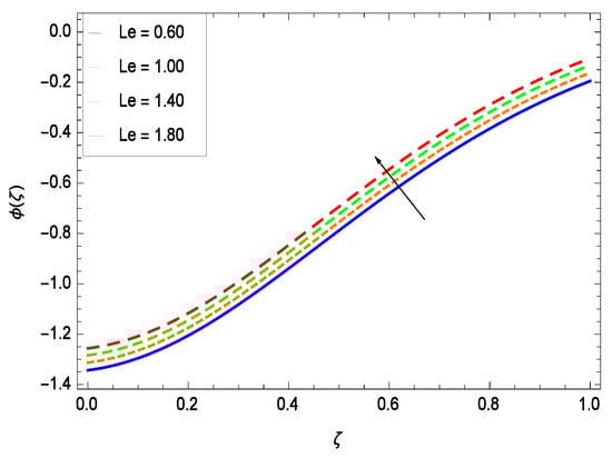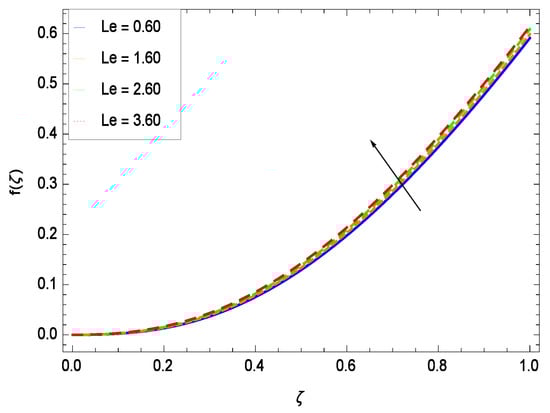 Effect on velocity profile for h = −5.00, = 0.50, = 0.60, = 0.20, = 0.30, = 1.00, Gr = 0.50, Rb = 0.70, Nb = 0.80, Nt = 0.90, Nr = 0.60, Sc = 0.70, Pe = 1.00, M = 1.00, Pr = 10.00 and different values of Le.